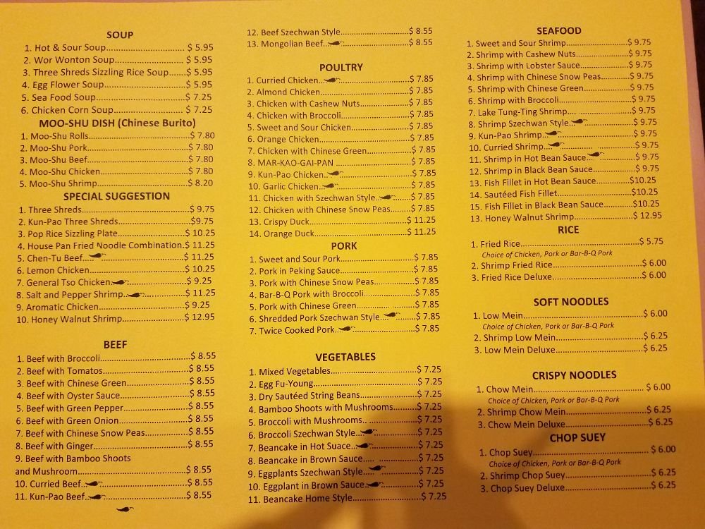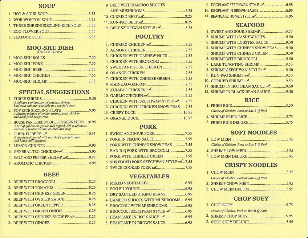 Shredded pork in a spicy Szechwan sauce. Choice of egg drop, hot & sour, or wonton soup. Served with fried or steamed rice.