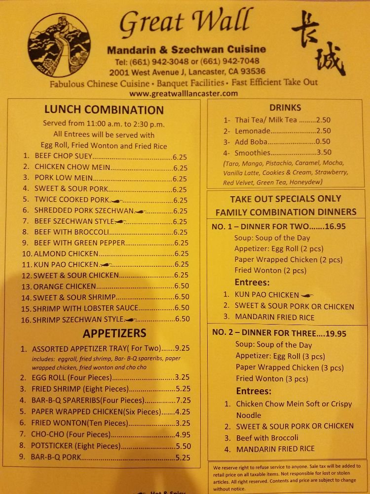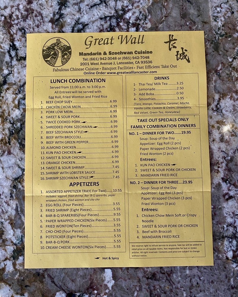 Great Wall, a Chinese seafood restaurant located in Lancaster, CA, offers a diverse menu with a focus on soups and seafood dishes. The restaurant provides a range of utilities, including reservations, delivery, and takeout options, making it convenient for customers. With limited vegetarian options available, Great Wall caters to a variety of dietary preferences. The restaurant is wheelchair accessible and accepts credit cards, ensuring a hassle-free dining experience. Known for its casual atmosphere and moderate noise level, Great Wall is suitable for group gatherings, family dinners, or lunch dates. Boasting a full bar and happy hour specials, this Asian and women-owned establishment offers a unique dining experience. The outdoor seating, private dining options, and Wi-Fi access add to the restaurant's appeal, making it a versatile choice for various occasions. With a range of amenities and delicious dishes, Great Wall is a must-visit for fans of Chinese cuisine.